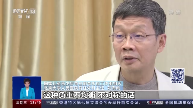 国家儿童青少年脊柱侧弯防控工作组组长、北京大学人民医院脊柱外科主任 刘海鹰:你站着叉腰或者是两边不对称的话,除了脊柱的负荷不均衡,你的髋关节,包括一侧的膝关节,这种负重不均衡、不对称的话,也会同时加速关节的一个损毁。